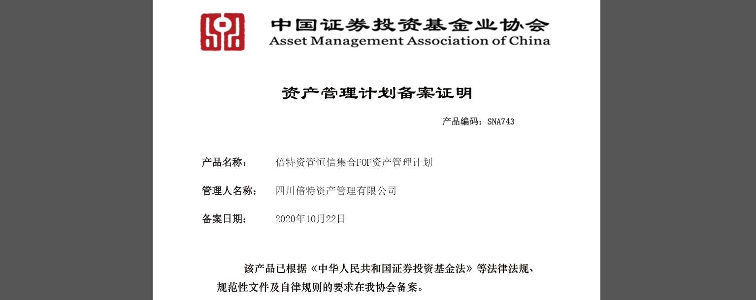 2020年10月21日,倍特期貨有限公司(以下簡稱“倍特期貨”)資產(chǎn)管理子公司——四川倍特資產(chǎn)管理有限公司(以下簡稱“倍特資管”)發(fā)起設(shè)立的資產(chǎn)配置策略私募FOF產(chǎn)品“倍特資管恒信集合FOF資產(chǎn)管理計劃”成立,并于10月22日通過中國證券投資基金業(yè)協(xié)會備案。瀏覽 : 8562分享